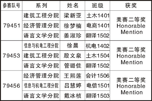 近日,2018年美国(国际)大学生数学建模竞赛(MCM/ICM)成绩揭晓,我分院两支学生参赛队伍均获“美赛”二等奖(H奖)。
