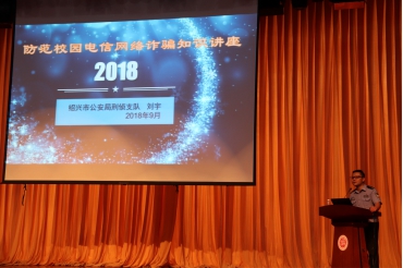 最后,由绍兴市公安局刑侦支队刘宇警官对新生们进行了防范校园电信网络诈骗知识讲座。刘警官为新生们讲解了几种校园常见的电信诈骗手段以及如何防范,提高了同学们的警觉性和防范意识。