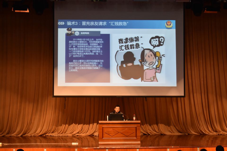 特邀主讲人陈诚警官从“什么是电信诈骗?”入手开始讲解,通过对典型电信网络诈骗案例的简单分析引出主讲话题,之后又剖析电信网络诈骗案例中犯罪分子惯用的手法和技巧。其中,陈警官举了12个骗术案例,还为我们普及了六种其他常见手法,向同学们详细讲解网络诈骗犯罪分子的作案手段并总结五招补救措施。